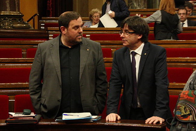 Efe – La idea de Carles Puigdemont es «contraria al Parlament y a la Constitución» porque el artículo 146 del reglamento del Parlament «entiende que tiene que haber una presencia» del candidato y «un ejercicio dentro» de la Cámara. Una investidura de forma telemática o delegada supone «retorcer el reglamento al cien por cien y va en contra de lo establecido en el Estatuto» catalán. Barcelona (España), jueves 11 de enero de 2018. Fotografía: El preso golpista Oriol Junqueras, alias el ‘osito’ o el ‘junqui’ (i) junto al fugado delincuente Carles Puigdemont (d) durante una sesión del Parlamento de Cataluña. Archivo ACN