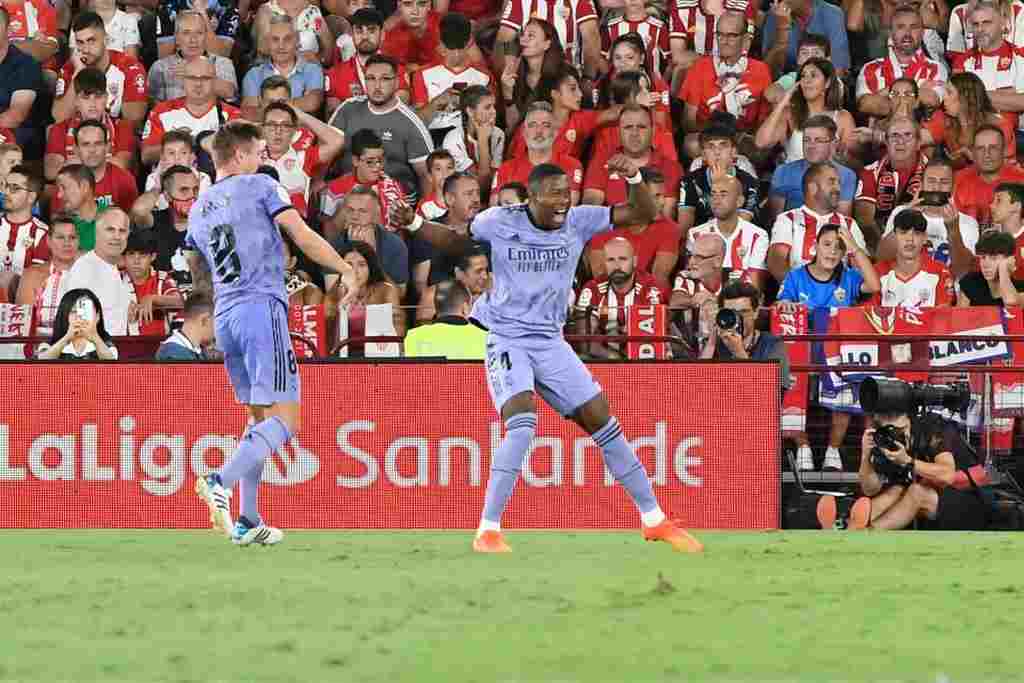 Efe.- Almería (España), domingo 14 de agosto de 2022. El campeón de Liga comenzó su andadura en la temporada 2022/2023 con una sufrida victoria fuera de casa (1-2) frente al Almería, recién ascendido a Primera, que se adelantó a los seis minutos con un tanto de Ramazani y le obligó a ir a remolque hasta encontrar la remontada en el segundo periodo con las dianas de Lucas Vázquez y de David Alaba, este de falta directa y en el primer balón que tocaba.