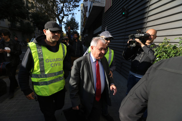 Lasvocesdelpueblo y Agencias – Los diez corruptos detenidos entre los cuales un alto cargo del gobierno catalanista y el tesorero de Convergencia Democrática de Cataluña de Artur Mas Gavarró, formación corrupta y principal impulsora de la candidatura separatista catalana al 27-S, Juntos Por El Sí (JxSí) -para tapar los robos y atracos del dinero de los catalanes y del resto de España- en la tercera fase de la operación ‘Petrum’ pasarán a disposición judicial entre mañana y el viernes en el juzgado número 1 de El Vendrell. Allí, deberán responder por los presuntos delitos de tráfico de influencias, fraude fiscal, cohecho , blanqueo de capitales o alteración de los precios en concursos y subastas públicas. Los detenidos, entre los que está el tesorero de CDC y de la fundación CatDem, Andreu Viloca, y el consejero delegado de Infraestructures.cat, Josep Antoni Rosell, y ocho directivos de empresas constructoras, pasarán la noche en la comandancia de la guardia civil de Tarragona. Barcelona, 21 de octubre 2015. <Fotografía: El tesorero de CDC, Andreu Viloca, es custodiado por la Guradia Civil a la entrada de la sede del partido>.