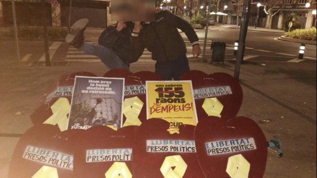 Con herramientas improvisadas, arrancaron de las farolas de la «calle principal» de esta localidad como pudieron, la propaganda separatista de «todo tipo»: Corazones con lazos amarillos, en referencia al apoyo del secesionismo a sus presos golpistas, los «Jordis» y exconsejeros, Oriol Junqueras, alias el ‘osito’ o el ‘Junqui’, y al de Interior Joaquim Forn.