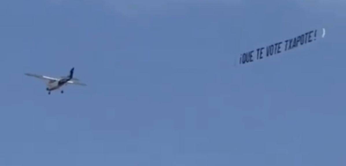 España responde al PSOE y a su candidato con la frase «¡Que te vote Txapote!» en gorras, camisetas, tazas,y esta vez ya lo hace también desde los cielos del Reino.