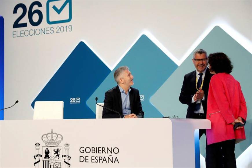 La subsecretaria del Ministerio del Interior, Isabel Goicoechea, y el secretario de Estado de Comunicación, Miguel Ángel Oliver, han informado en el centro de datos de Ifema del arranque de esta jornada electoral marcada por la complejidad, ya que se celebran tres comicios a la vez: europeos, locales y autonómicos.