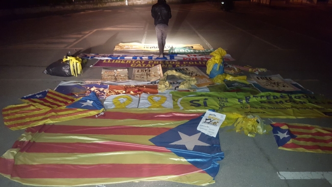 Trapos con estrella, carteles invasores «Municipio de la República Catalana», propaganda partidista de «CUP» y escuadras de asaltas independentistas, propaganda del referéndum ilegal «Sí República», lazos amarillos y cartel humillante contra la democracia española insinuendo que España es una dictadura con presos políticos como «Libertad presos políticos» en referencia a su Políticos Presos golpistas en las cárceles de la capital de la Nación española; estos son algunos de los trofeos de los valientes hijos de España anoche en Cataluña.