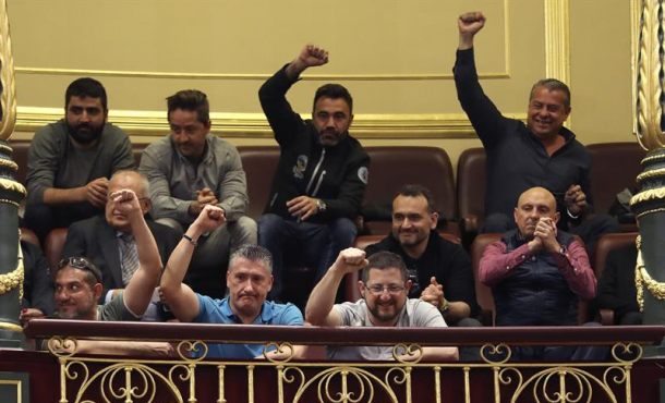 Efe – Asimismo, Goya ha agradecido a todos los medios de comunicación la posibilidad que les han brindado a los trabajadores portuarios para poder transmitir la realidad de su trabajo y de su situación y dejar «esa campaña inicial que hubo con la intención de menospreciar el nombre de los estibadores». Madrid (España), jueves 16 de marzo de 2017. Fotografía: Un grupo de estibadores saludan desde la tribuna de invitados del Congreso donde hoy se debatía el real decreto ley de reforma de la estiba. Efe.