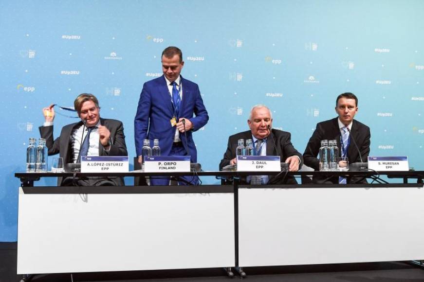 Efe – «Los intentos catalanes de secesión son contrarios a la ley y la democracia». La resolución tiene seis párrafos de exposición de motivos en los que se narra lo sucedido en la región española de Cataluña desde el 6 de septiembre de 2017. «Condenamos toda secesión ilegal como alteración política de la realidad, contraria a la ley y la democracia en si misma», dice el texto. Fotografía: HELSINKI (FINLANDIA), 06.1102018. De izquierda a la derecha d ela imagen: El secretario general del Partido Popular Europeo (PPE), Antonio López-Istúriz, el ministro de Finanzas finlandés, Petteri Orpo, el presidente del PPE, Joseph Daul, y el eurodiputado popular rumano, Siegfried Muresan, durante el Congreso del PPE en Helsinki, Finlandia. Efe