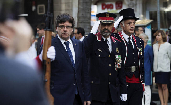 Efe – Entre la documentación que la Policía Nacional intervino a los Mossos d’Esquadra frente a una incineradora de Sant Adrià del Besòs (Barcelona) el pasado 26 de octubre, la víspera de la votación en el Parlament de la declaración unilateral de independencia, figuran documentos que apuntarían a un supuesto espionaje a dirigentes políticos, sindicales y abogados, entre ellos Bosch. Las cinco querellas fueron interpuestas contra los Mossos d’Esquadra por Bosch, el secretario general del Sindicato de Policías de Cataluña (SPC), David José, por su esposa -por el supuesto espionaje del que también fue víctima su hijo menor de edad-, el abogado de este sindicato policial, José María Fuster-Fabra, y la plataforma Barcelona con la Selección. Barcelona (España), lunes 29 de enero de 2018. Fotografía: Los delincuentes golpistas hispanófobos racistas separatistas, el expresidente de la Generalidad de Cataluña cesado tras su golpe de estado con la complicidad de los Mozos de Escuadra, Carles Puigdemont, junto a Josep Lluís Trapero, el ex major de los Mozos de escuadra, también cesado, investigado con prohibición de salir de España. Archivo Efe
