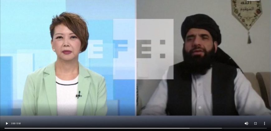 Efe.- Pekín (China), viernes 20 de agosto de 2021. Incluye las imágenes de CCTV, no aptas para su uso dentro del territorio chino, de las declaraciones dadas por el portavoz de la Oficina Política del Emirato Islámico de Afganistán (Talibanes) en Qatar, Suhail Shaheen, en la televisión china Media Group. El portavoz de la oficina política de los talibanes en Catar, Suhail Shaheen, aseguró este jueves que las mujeres pueden seguir disfrutando seguir en sus empleos y sus estudios.