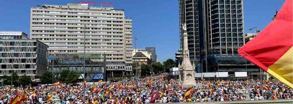 Redacción.- Madrid (España), domingo 13 de junio de 2021. «Yo votante del PSOE, al pueblo pido perdón y al Gobierno, su dimisión». Una marea humana rojigualda transversal de votantes de VOX de Santiago Abascal Conde, del PP de Pablo Casado Blanco, de Ciutadans-Ciudadanos (Cs) de Inés Arrimadas García, del PSOE (un 52,7% según encuestas del 6 de junio de 2021) del secretario general y presidente de Gobierno de coalición de España Pedro Sánchez Pérez Castejón y de Podemos (el 24,3% según sondeos) de Ione Belarra Urteaga, la elegida, este domingo 13 de junio, nueva secretaria general de Podemos en sustitución del dimitido exvicepresidente Pablo Manuel Iglesias Turrión (Pablo Iglesias) y actual ministra de Agenda 2030 también en sustitución de Pablo Iglesias en el Gobierno de coalición de España se han reunido este mediodía en Plaza Colon de la capital del reno de España, Madrid, contra la concesión de los indultos a los 12 condenados por los acontecimientos violentos y antidemocráticos acaecidos el pasado mes de octubre de 2017 en la Comunidad autónoma de Cataluña, que el jefe de Ejecutivo de coalición de España Sánchez se abre a cometer, en contra de la opinión pública (según sondeos sólo el 29,5% de los españoles está a favor de los indultos) probablemente antes del final del próximo verano de 2021; y, además, han protestado contra la reanudación de las negociaciones de la «mal llamada» «Mesa de Diálogo del Procés» entre Gobierno de coalición separatista de la Generalidad de Cataluña del presidente Pere Aragonés García (ERC) y Gobierno de coalición de España de Sánchez, interrumpida iniciada en febrero de 2020 y fue interrumpida por la crisis sanitaria del covid 19, donde los Aragonés García, en nombre del separatismo, y Sánchez, en nombre del pueblo español, debatirán sobre la amnistía de todos los procesados por por el Procés, entre ellos el máximo responsable del golpe de estado secesionista en Cataluña, huido a Waterloo (Bélgica), Carles Puigdemont Casamajò (JxCat), la autodeterminación de Cataluña como «Nación» en Europa, al igual que Escocia (Reino Unido), con las condiciones de la celebración de una referéndum de independencia de Cataluña, como condiciones y soluciones para cerrar «las heridas», según defienden los protagonistas secesionistas: ERC, CUP, JxCat y asociaciones separatistas Asamblea nacional catalana y Ómnium Cultural.