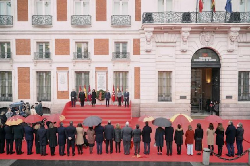 En la ceremonia, que ha comenzado a las 09:00 horas y durante la que no ha cesado de llover, han tañido las campanas del reloj de la sede de la Presidencia regional, junto con las de las iglesias de toda la Comunidad de Madrid.
