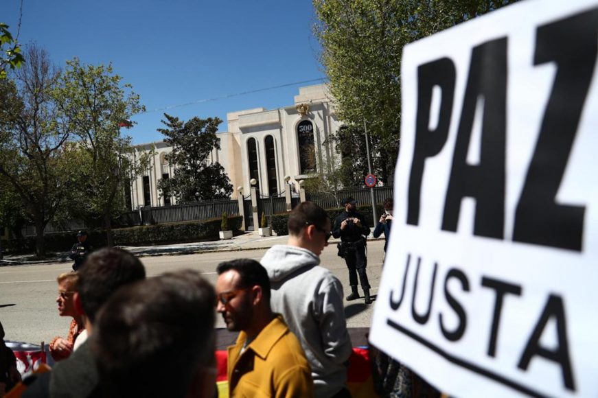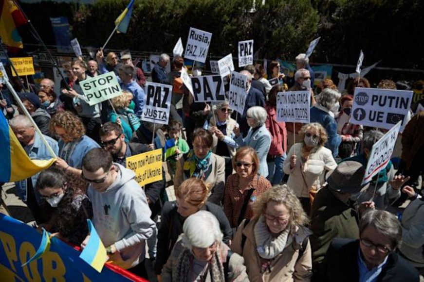 Efe.- Madrid (España), domingo 24 de abril de 2022. Unas cincuentas personas, según la delegación del Gobierno, se han concentrado este domingo frente a la Embajada de Rusia en Madrid para pedir «protección» a la población civil ucraniana y rechazar la «invasión» del presidente ruso, Vladímir Putin, en el país vecino, en una protesta convocada por el Movimiento por la Paz (MPDL).
