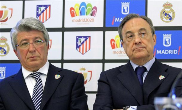 Agencias – El Real Madrid y el Atlético de Madrid no podrán fichar ni dar de alta «a ningún futbolista nacional o extranjero durante los próximos dos periodos de contratación íntegros» después de que la FIFA haya confirmado este jueves la sanción a ambos clubes por traspasos internacionales de menores. Madrid, 14 enero 2016. Fotografía: Los presidentes del Real Madrid CF y del Club Atlético de Madrid, Florentino Pérez (d) y Enrique Cerezo (i). Efe.