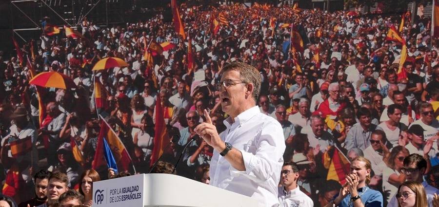 Ante 40.000 personas según la Delegación del Gobierno, 60.000 según el PP, y con el apoyo de su cúpula, del plantel completo de sus presidentes autonómicos y de los expresidentes José María Aznar y Mariano Rajoy, Feijóo ha dicho que responderá a la «cacicada» de la amnistía «cueste lo que le cueste», incluida la presidencia del Gobierno.