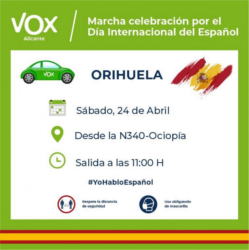 Comunicado VOX Comunidad Valenciana, Orihuela, 23 de abril de 2021. Estimado compañero, con el motivo del Día Internacional del idioma español que este viernes, 23 de abril de 2021, se conmemora en las Naciones Unidas, me es grato convocarte a la marcha en vehículos el próximo sábado, 24 de abril, en Orihuela para conmemorar juntos el Día del Español.