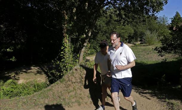 El «protagonista» de la jornada, Mariano Rajoy, ha disfrutado, de nuevo y como tiene por costumbre, de este entorno natural, salpicado de molinos de agua, fuentes y curiosos lavaderos, y, al término de su trayecto, iniciado en la rotonda de Barrantes, ha tenido el suficiente resuello, tras superar la última travesía, que es la más empinada, para dejarse inmortalizar con todo aquel que así se lo ha pedido, empezando por estos atletas.