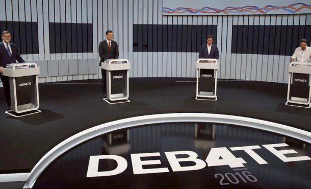 Efe – El líder del PP, Mariano Rajoy, ha arremetido esta noche, en el segundo bloque del debate ‘a cuatro’, contra el secretario general del PSOE, Pedro Sánchez. «Sería usted un pésimo presidente para los intereses generales de los españoles», le ha dicho. Madrid (España), lunes 13 de junio 2016. Fotografía: El presidente del Gobierno en funciones y del PP, Mariano Rajoy (i), el líder del PSOE, Pedro Sánchez (2i), el presidente de Ciudadanos, Albert Rivera (2d), y el secretario general de Podemos, Pablo Iglesias (d), tras sus atriles. Efe.