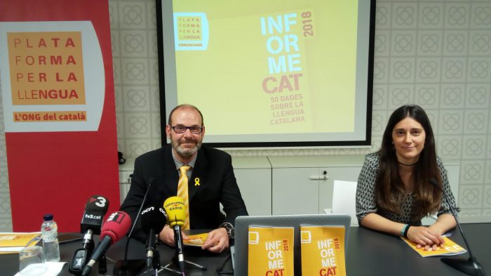 La organización independentista «Plataforma por la Lengua Catalana» ha presentado este viernes, 8 de junio de 2018, su InformeCAT18, la recopilación de las 50 datos más relevantes sobre la situación de la lengua catalana.