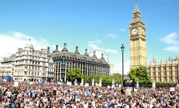 Bajo el título «Marcha por Europa», unas 40.000 personas, según los medios locales, iniciaron la marcha desde Park Lane, en el centro de la ciudad, hasta la plaza del Parlamento, donde cantaron y pidieron a gritos mantener los lazos con Europa. El evento se ha celebrado nueve días después del histórico referéndum sobre la Unión Europea, en el que los británicos votaron con casi el 52 por ciento de apoyo a favor de salir del bloque comunitario, pero cuyo resultado ha provocado una crisis política en el Reino Unido, con repercusiones para la economía del país.