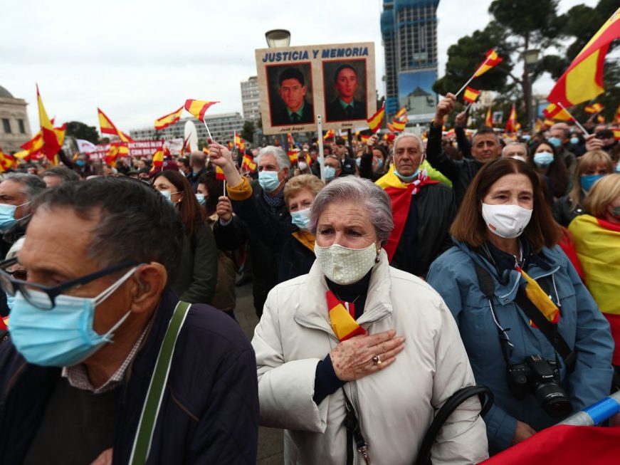Lasvocesdelpueblo y Agencias.- Madrid (España), sábado 26 de marzo de 2022. Miles de personas han protestado este sábado en la Plaza Colón, en Madrid (España), convocadas por la Asociación de Víctimas del Terrorismo (AVT), que dice estar «harta» de que el Gobierno blanquee a quienes aún no han condenado los crímenes de ETA y de que desprecie a las víctimas. «Basta ya de mercadear con la memoria de los muertos».
