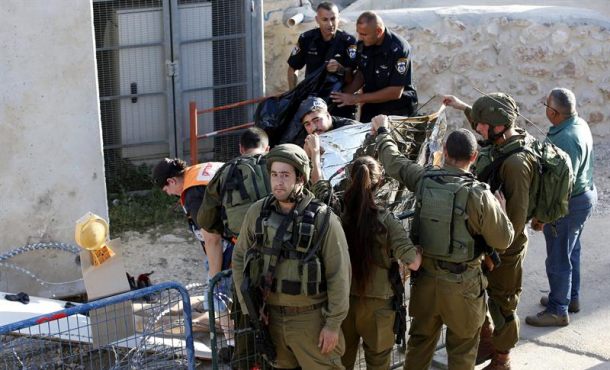 Agencias – Según el parte militar, el soldado ha sido trasladado a un hospital en Jerusalén para tratamiento, mientras que el palestino murió por los disparos de otros efectivos en la zona. Un palestino murió hoy tiroteado por soldados israelíes tras atacar a uno de ellos con un cuchillo en un cruce del distrito de Hebrón, informaron fuentes militares. Jerusalén (Israel), viernes 16 de septiembre de 2016. Fotografía: Miembros de las fuerzas de seguridad israelíes permanecen junto al cuerpo de un palestino tiroteado tras atacar a un soldado con un cuchillo en el distrito de Hebrón hoy, 16 de septiembre de 2016. Efe.