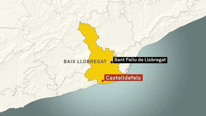Una mujer catalana ha muerto apuñalada en la calle esta mañana, de miércoles 12 de agosto 2015, en Casteldelfels; ciudad y municipio español de la comarca catalana del Bajo Llobregat (Barcelona). La Policía Local ya ha detenido al presunto agresor después de que unos valientes vecinos de la localidad han ayudado a retener el asesino. Todo apunta a que se trata de la ex-pareja de la víctima. La policía catalana, ‘Los Mossos de Escuadra’, ha abierto una investigación sobre las circunstancias de la muerte. <Fotografía: Mapa de localización del municipio de Casteldelfels, en Barcelona>.