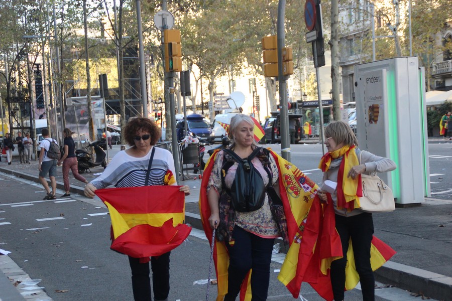 Vídeo. Barcelona, 29.10.2017. La mujer multibanderas de Cataluña muestra su orgullo español, llevando las banderas de España «por todos los lados»