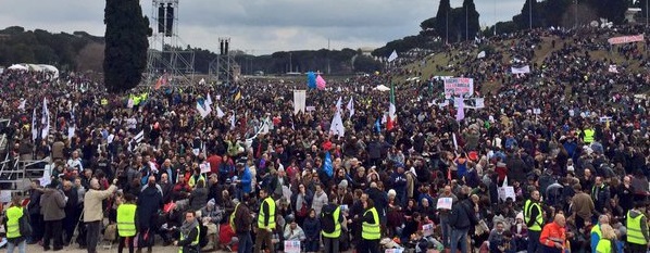 Los manifestantes que celebraban el «Día de la Familia» en inglés, «Family Day» y con la etiqueta #FamilyDay, se concentraron en el Circo Máximo de la capital para protestar contra el proyecto de ley que estudiará el Senado la próxima semana y que prevé reconocimiento legal de las parejas del mismo sexo y la adopción por parte de uno de los miembros del hijo natural de su pareja.