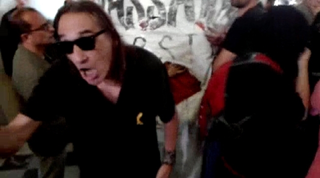 Redacción – Ocurrió en la Universidad de Barcelona (UB) este jueves. Energúmenos de los CDR y terroristas independentistas boicotean un acto sobre la lengua española lanzando consignas amenazantes, haciendo ruidos, aporreando las puertas de la sala de conferencia, y bocinazos. «Eso es fascismo; si es fascismo. Es inaceptable. Cataluña se queda pobre, intolerante; se queda fascista como su presidente (Quim Torra) y con el beneplácito de los Mozos (separatistas)», denuncia este destacado asistente en el acto boicoteado este jueves en la Universidad de Barcelona por los CDR y terroristas de «Tierra Libre». Barcelona (España), viernes 8 de junio de 2018. Fotografía: UNIVERSIDAD DE BARCELONA (UB) ESPAÑA, 07.06.2018. En el primer plano de la izquierda de la imagen, el terrorista fundador de la banda ‘Tierra Libre (Terre Lluire)’, Frederic Bentanachs Chalaux increpando a la Cataluña pacífica, en una vista de la ofensiva racista de los terroristas y ‘Comités de Defensa de la República Catalana’ (CDR) este jueves a la (UB) donde han conseguido romper el acto sobre la lengua española. Lasvocesdelpueblo