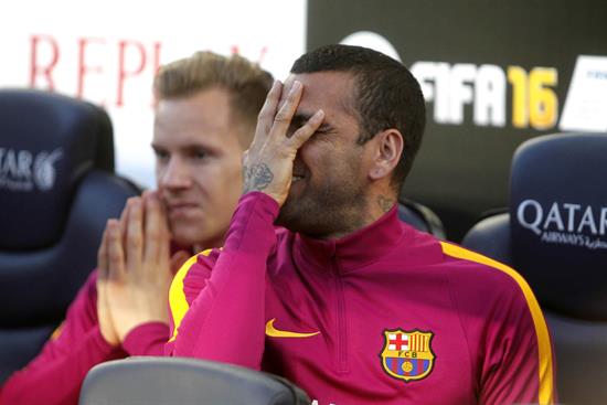 Lasvocesdelpueblo y Agencias – Cara de poema del separatista Gerard Piqué Bernabéu al final del Partido, se quedó pensado y caminó poco a poco cabeza abajo hacia los vestuarios. Duro golpe de FC Barsa en el Campo Nuevo. Cae el equipo catalán ante el número 14 de la clasificación d ela liga española. FC Barcelona solo gana un punto de los 12 de los últimos partidos y ya no aguanta la presión de los equipos de la capital de la patria -la gente de «medrit» como dicen los ultras culés para no decir «Madrid» en español. Así queda la clasificación: en primera posición FC Barsa que empata con Atlético de Madrid a 76 puntos seguido de cerca con el equipo merengue a solo un puntos, 75 puntos. Barcelona, 17 de abril 2016. Fotografía: El defensa brasileño del FC Barcelona Dani Alves en el banquillo durante el partido frente al Valencia de la 33ª jornada de Liga de Primera División en el Campo Nuevo. Efe.