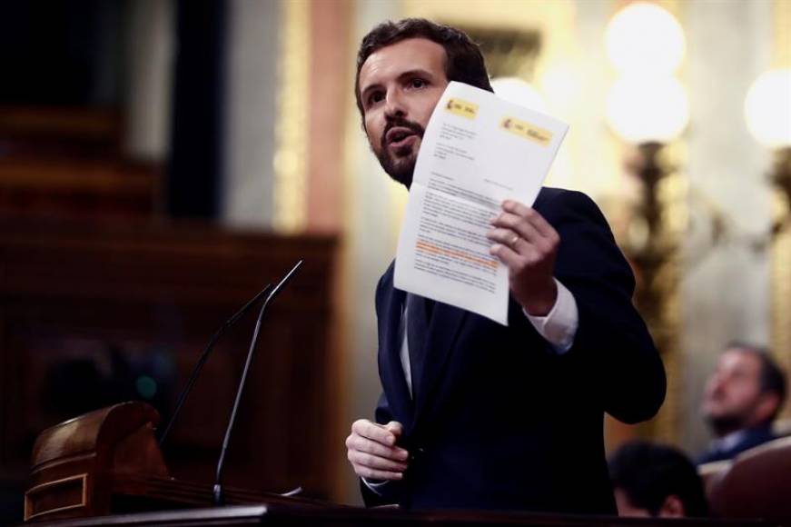 Efe – El presidente del PP, Pablo Casado afirma que el presidente del Gobierno «miente» al decir en su rueda de prensa de esta tarde que su Gobierno es de los que hace más test y denuncia que no entiende que Pedro Sánchez pida unidad y «yo me entero de sus medidas por TV». Madrid (España), domingo 26 de abril de 2020.