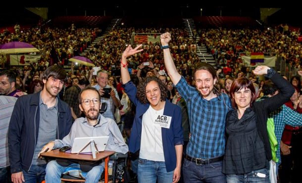 Lasvocesdelpueblo y Agencias – La formación podemita antepone el derecho a la autodeterminación de Cataluña y País Vasco a los derechos sociales de la gente que padece las consecuencias de crisis. Queda claro que Podemos no es un partido de izquierda para la clase trabajadora española. Para Podemos, sus votantes del resto de España -excepto de Cataluña y País Vasco- son ciudadanos de segunda; por lo que el derecho de los separatistas catalanes y vascos está por encima de cualquier andaluz, madrileño, valenciano, etc., votante de Podemos. Barakaldo (Bizkaia), 6 mayo 2016. Fotografía: El líder de Podemos, Pablo Iglesias (d), junto al secretario de Organización, Pablo Echenique (2i) Eduardo Maura (i), la diputada en el Congreso por Guipúzcoa, Nagua Alba (c) y la senadora por Bizkaia, Miren Gorrotxategi (d), esta tarde en Barakaldo durante un acto en el que expone la estrategia política y organizativa del partido ante la nueva convocatoria electoral del 26 de junio en su primer mitin en el Pais Vasco, comunidad que hasta ahora no había visitado como dirigente político. Efe.