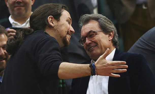 Lasvocesdelpueblo y Agencias – ¿Cómo justificar esta tolerancia 100% del secretario general de Podemos, Pablo Manuel Iglesias Turrión, con la Derecha «corrupta» catalana -la Convergencia (CDC) del expolio del Palacio de la Música; del clan del ‘Reino sin trono’ de la Familia Pujol-, y la muy mala relación entre Pablo Iglesias con Podemos y el presidente Mariano Rajoy con el PP ( o la Derecha Española en general)? Esta fotografía es de este fin de semana, del 19 de marzo de 2017, con la condena del líder de CDC y ex presidente de la Generalidad, Artur Mas, por el 9N y el Juicio de saqueo de CDC -con Más presidente- sobre la mesa. Barcelona (España), lunes 20 de marzo de 2017. Fotografía: El líder de Podemos, Pablo Iglesias (i), conversa con el condenado expresidente de la Generalidad, Artur Mas (d), en el Palacio Municipal de Deportes de Badalona, durante el partido de la Liga ACB que disputan Joventut y Barcelona Lassa, en el 50 aniversario de la primera Liga que conquistó el Joventud en 1967. Efe.