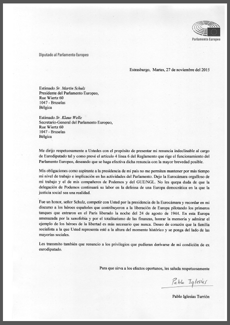 Redacción – Carta de dimisión del líder de Podemos. El secretario general de Podemos, Pablo Manuel Iglesias Turrión (Nacido en Madrid, 17 de octubre de 1978) se ha despedido hoy del Euro Parlamento ocupando el sexto puesto en el ranking de actividad de los eurodiputados españoles, en el que llegó a figurar en segunda posición tras el verano. El grupo parlamentario de Podemos ha trabajado para dar visibilidad y respaldar diferentes luchas políticas y sociales de la ciudadanía. Estrasburgo, 27 de octubre 2015. <Fotografía: El líder de Podemos, Pablo Iglesias, foto archivo Wikipedia>.