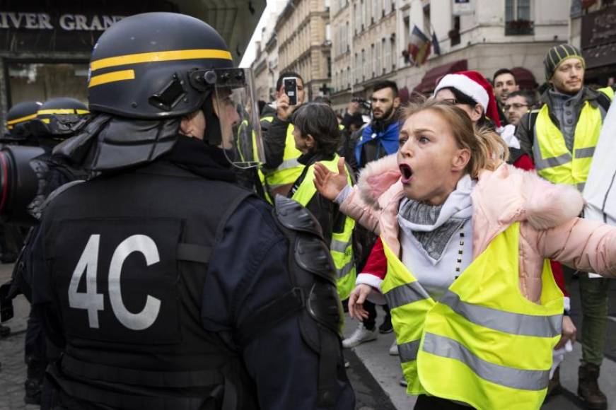 Lasvocesdelpueblo y Agencias – El portavoz del Gobierno de la República francesa del presidente Emmanuel Macron, Benjamin Griveaux: «Los Chalecos Amarillos son agitadores que quieren la insurrección y derrocar al Gobierno» que han entrado en «una lucha política para cuestionar la legitimidad del presidente de la República». Preguntado sobre si eso significa que hay que evacuar todas las rotondas donde se siguen concentrando los «chalecos amarillos», su respuesta fue que «nadie está por encima de las leyes en Francia». París (Francia), sábado 5 de enero de 2019. Fotografía: PARÍS (FRANCIA), AÑO 2019. Una manifestante grita a un policía antidisturbios durante una manifestación de los «chalecos amarillos» franceses en Parí, Francia. Efe.
