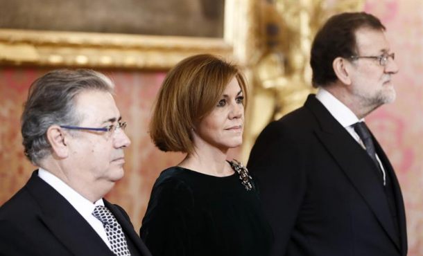 Efe – La ministra de Defensa, María Dolores de Cospedal, ha asegurado hoy que las Fuerzas Armadas (FAS) y la Guardia Civil son «una herramienta leal y eficaz» para «garantizar el futuro de España», de su estado democrático de derecho, su seguridad y su prosperidad. Madrid (España), jueves 6 de enero de 2017. Fotografía: El presidente del Gobierno, Mariano Rajoy (d), junto a la ministra de Defensa, María Dolores de Cospedal (c), y el ministro del Interior, Juan Igancio Zoido (i), durante la la celebración de la Pascua Militar que ha presidido el rey Felipe VI en el Palacio Real. Efe.