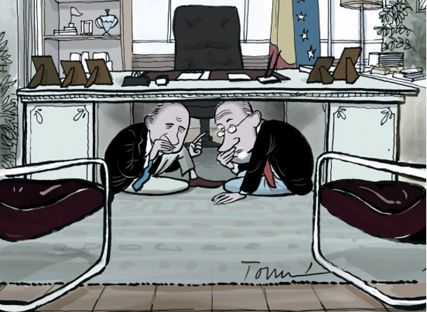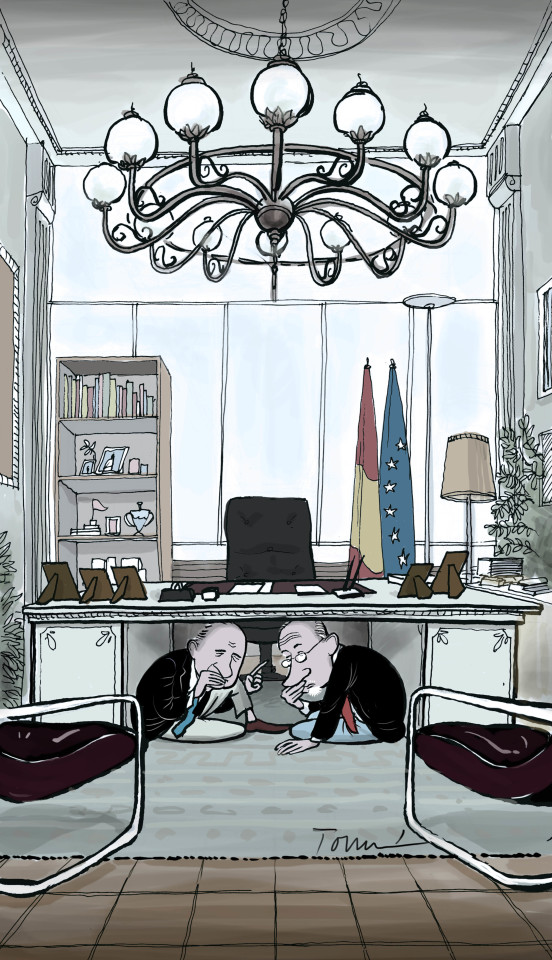 Partamos de la base de que yo creo a pies juntillas que Rato y Fernández no cerraron ningún trato inconfesable en su conversación del ministerio. Como bien refleja el dibujo, lo vergonzoso en sí, lo que obliga al pudor a meterse debajo de la mesa, fue el propio encuentro en el despacho oficial. A partir de que el ujier abrió la puerta del Excelentísimo al imputado acogotado, lo que se tratara allí ya sólo era un elemento ornamental. Un a más a más. Porque el medio era el mensaje y la noticia el encuentro en sí.