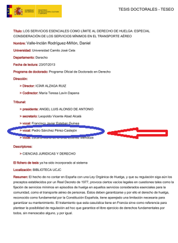 El tribunal, tal y como se aprecia en el documento aportado, estaba compuesto por Ángel Luis Alonso de Antonio (como presidente), Leopoldo Vicente Abad Alcalá (secretario) y Francisco Javier Esteban Guinea, Pedro Sánchez Pérez-Castejón y Lucana María de la Cruz Estéve (como vocales) en la Universidad Camilo José Cela. La lectura de la tesis se realizó el 23 julio de 2013.