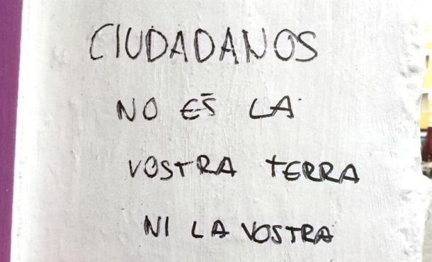 Los atacantes, presuntos ‘separatas’, aseguran en catalán: «Ciudadanos, no es vuestra tierra ni vuestra lucha» o «Albert ‘cocas'» son algunas de las pintadas con las que ha amanecido el local de los padres de Rivera.