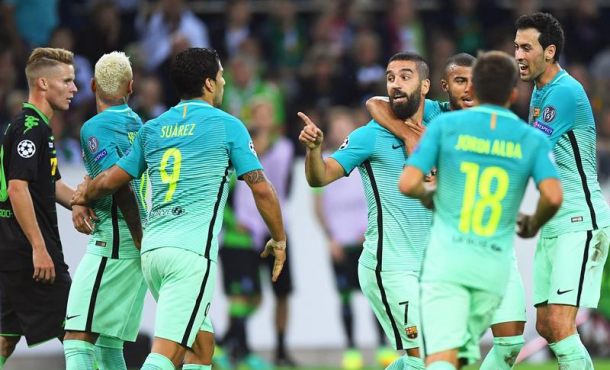 Goles: 1-0, min. 34: Thorgan Hazard. 1-1, min. 65: Arda Turan. 1-2, min.74: Piqué. Árbitro: Damir Skomina (Eslovenia). Mostró cartulina amarilla a Mascherano (min.63), Piqué (min.70) y a Neymar (min.90+1). Incidencias: Asistieron al encuentro 46.283 espectadores en partido de la segunda jornada de la primera fase de la Liga de Campeones, grupo C, disputado en el Estadio Borussia Park.