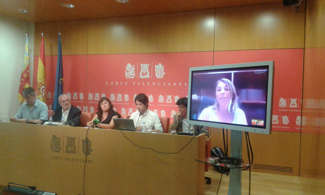 La secretaria de Acción Institucional del Consejo de Coordinación estatal de la formación de Pablo Iglesias, Podemos, Auxiliadora Honorato, ha presentado en la mañana de este miércoles en las Cortes autonómicas Valencianas la primera iniciativa parlamentaria de su formación coordinada a nivel estatal en siete Parlamentos Autonómicos: la proposición de una Ley de Cuentas Abiertas. Según fuentes de la organización de pablo Iglesias, esta propuesta de Ley de Cuentas Abiertas, con un coste mínimo, facilitará a los ciudadanos toda la información sobre los ingresos y gastos, euro a euro, de cada institución pública, de la misma forma que se pueden consultar los movimientos de una cuenta corriente personal, con todas las cautelas que recoge la Ley de Protección de Datos. Murcia, Comunidad Valenciana, La Rioja, Extremadura, Castilla-La Mancha y Castilla y León son las comunidades autónomas en las que Podemos presentará esta iniciativa legislativa, tras haberlo hecho recientemente en Andalucía, asegura Podemos. <Fotografía: Rueda de prensa ofrecida este miércoles, 15 de julio 2015, en Valencia por la secretaria de Acción Institucional del Consejo de Coordinación estatal, Auxiliadora Honorato, junto a Segundo González y Miguel Ongil, diputado de Podemos en la Asamblea de Madrid>.