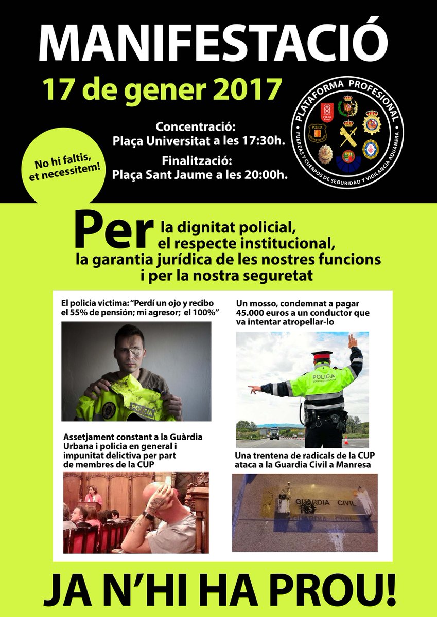 Redacción – Manifestación 17-01-2017 en Barcelona: «Exigimos respeto por nuestro labor como policías, despolitización de nuestros colectivos, y un apoyo y defensa Real sin titubeos por parte de nuestras administraciones». La «Plataforma Profesional Fuerzas y Cuerpos de Seguridad y Vigilancia Aduanera» aduanera que agrupa a casi todas las asociaciones de Policía (Nacional y locales) en España ha convocado una concentración en Cataluña para el próximo martes 17 de nero de 2017 para exigir un «respeto a su trabajo». Barcelona (España), domingo 8 de enero de 2017. Fotografía: Cartel de la convocatoria del 17E 2017 en defensa de un poco de respeto a las fuerzas de seguridad del Estado de Plataforma Profesional Fuerzas y Cuerpos de Seguridad y Vigilancia Aduanera. Lasvocesdelpueblo.