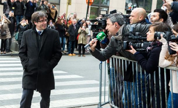 Lasvocesdelpueblo y Agencias – El ex presidente de la Generalidad de Cataluña, Carles Puigdemont, ha abandonado a su suerte a todos los suyos en Cataluña para vivir como fugitivo en la región separatista belga, Región Flamenca. La Audiencia Nacional citó a Puigdemont y a otros trece miembros del ex Gobierno catalán para el jueves a las 09.00 horas (08.00 GMT), en relación a los delitos de rebelión, sedición y malversación de fondos públicos en el proceso separatista en Cataluña. Fotografía: BRUSELAS (BËLGICA), 31.10.2017. El expresidente de la Generalidad de Cataluña Carles Puigdemont (i) llega al club de la prensa en Bruselas para comparecer ante los medios de comunicación, en Bruselas, Bélgica, ayer. Efe.