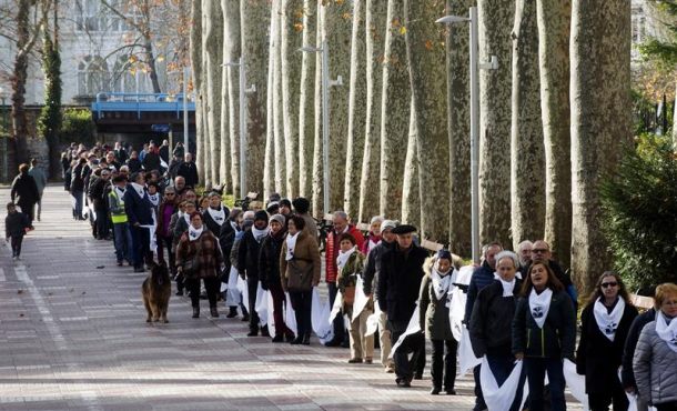 En Vitoria, los manifestantes, que iban unidos por pañuelos blancos, han recorrido el tramo que hay desde el Palacio de Ajuria Enea, residencia oficial del lehendakari, hasta el Parlamento Vasco, donde han celebrado un acto político en el que ha intervenido el portavoz de este colectivo Urtzi Errazkin.
