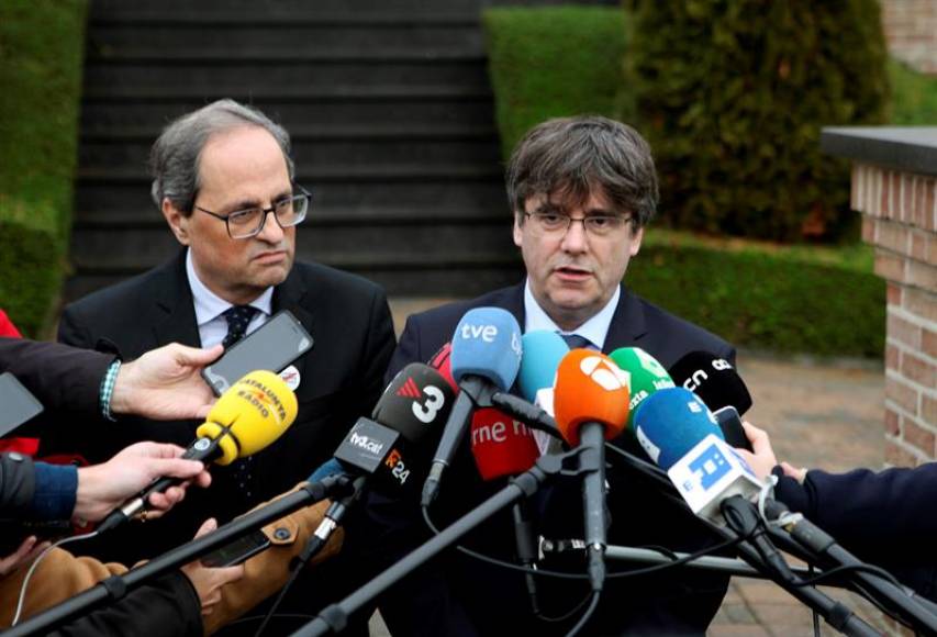 Lasvocesdelpueblo y Agencias – El ex alcalde de Gerona, nombrado presidente de Cataluña tras el fracaso de la investidura del inhabilitado Artur Mas, huido al Waterloo (Bélgica) después del golpe de estado del 27 de octubre de 2017, Carles Puigdemont, asegura que el independentismo votaría ‘NO’ a los presupuestos del presidente Pedro Sánchez (PSOE) porque: «No estamos en un escenario de negociación de partidas presupuestarias (…), estamos tratando de un conflicto político» y «esto no va de partidas presupuestarias concretas, va de derechos fundamentales que se están violando y especialmente uno muy importante que es el derecho a la autodeterminación de Cataluña, que podamos votar libremente, y ahí no hay ninguna novedad», ha dicho. Barcelona (España), lunes 14 de enero de 2019. Fotografía: WATERLOO (BELGICA), 11.01.2019. El independentista presidente de la Generalidad de Cataluña, Quim Torra (i), junto al huido golpista expresidente de la Generalidad de Cataluña, Carles Puigdemont (d), hacen unas declaraciones tras reunirse en Waterloo (Bélgica). Efe