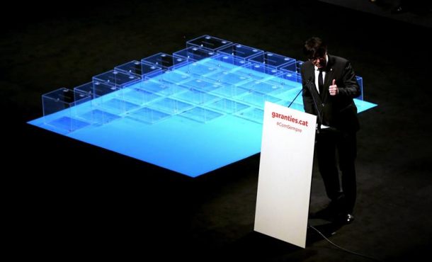 Puigdemont ha intervenido en el acto de presentación de las garantías del eventual referéndum separatista del 1 de octubre desde el escenario del Teatre Nacional de Cataluña, rodeado del resto del Gobierno catalán, diputados de la alianza de ERC y Convergencia PDECAT al 27-s de 2015 en Cataluña, Juntos Por El Si (JxSí), la presidenta del Parlamento de Cataluña, Carme Forcadell, y unas urnas de metacrilato.