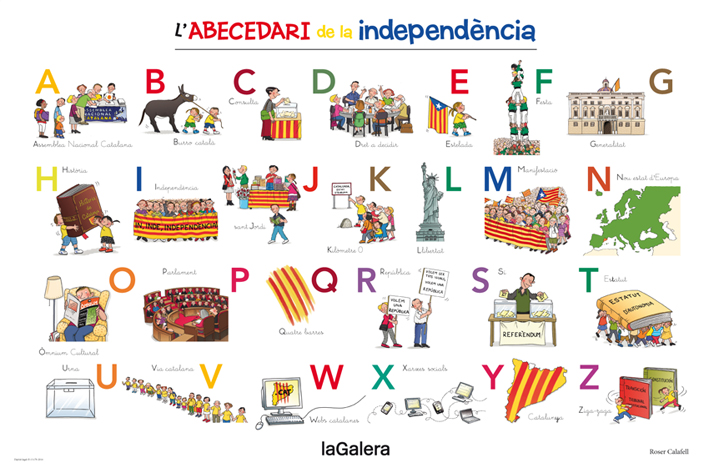 Lasvocesdelpueblo y Agencias – Todo ese dinero debe pagar el Gobierno catalán. Cada niño catalán de lengua materna el «español», escolarizado este curso escolar 2016-2017 en centro privado porque el gobierno catalán prohibe estudiar en «español» —hasta las clases de lengua española se dan en «catalán» para que el niño hable solo el «catalán» a casa con sus abuelos: doble adoctrinamiento separatista—, su familia recibirá, como el curso pasado 2015-2016, un total de 6.000 euros para estudiar en lengua oficial de la patria como el resto de niños españoles en el resto del territorio Nacional. Así ha decidido este jueves 29 de diciembre de 2016 el Gobierno del presidente Mariano Rajoy durante el Consejo de Ministros. Barcelona (España), sábado 31 de diciembre de 2016. Fotografía. Imagen del adoctrinamiento en escuela públicas en Cataluña. ‘La Galera’. «El Abecedario De La Independencia» de Cataluña [Datos del libro, EAN: 9788424653378]. Roser Calafell (ilustradora). Según los autores, se trata de: «Sinopsis. Un libro para que los niños y las niñas aprendan las letras del abecedario. Con ilustraciones de Roser Calafell. Cada letra tiene un motivo identificable con el proceso soberanista (Asamblea, Burro catalán, Consulta, etc.). Un libro que hará las delicias de los niños y las niñas (y adultos) y los acercará al momento histórico que estamos viviendo», firman sin pudor. Lasvocesdelpueblo.