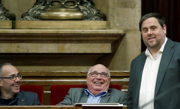 Lasvocesdelpueblo y Agencias – El separatismo ya calienta los motores para el golpe de estado. Hoy, el Gobierno del presidente Carles Puigdemont (CDC) -y su vicepresidente, Oriol Junqueras (ERC)- ha sacado a concurso público la adquisición de papeletas y sobres para el referéndum de autodeterminación en Cataluña previsto -como más tarde- en septiembre, según ha condicionado los ultras de CUP para dar luz verde al los presupuestos de la Generalidad de 2017. En concreto, se refiera a la compra de sobres, papeletas, un manual de instrucciones para los miembros de las mesas e impresos electorales, todo ello con un presupuesto de licitación de 775.714,26 euros. Barcelona (España), jueves 23 de marzo de 2017. Fotografía: El portavoz de Catalunya Sí que es Pot (CSQP), Joan Coscubiela (i); el líder de CSQP, Lluís Rabell (c); y el vicepresidente de la Generalidad, Oriol Junqueras, durante la tercera y última jornada de la sesión plenaria del Parlamento, un día después de la inhabilitación del portavoz de CDC en el Congreso de los diputados, Francesc Homs Molist, por el golpe del 9N de 2014 en Cataluña y de la aprobación de los presupuestos del Gobierno, que incluyen una alusión al referéndum que la oposición estudia llevar al Tribunal Constitucional. Efe.