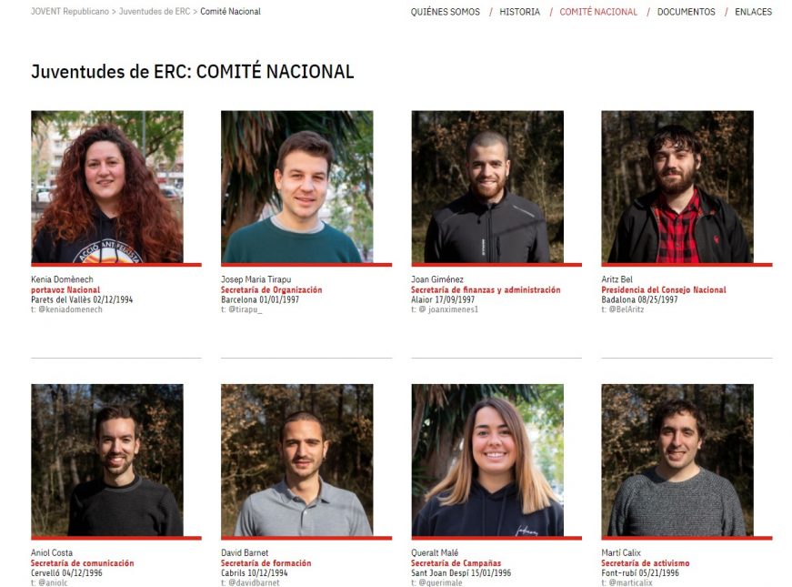 Asimismo, según datos y fotografías públicas de Jovent Republicà en su sitio web (https://joventrepublica.cat/), sus representantes y lugares de residencia son los siguientes: Kenia Domènech Ávarez, portavoz Nacional; Josep Maria Tirapu, Secretaría de Organización; Joan Giménez, Secretaría de finanzas y administración; Aritz Bel, Presidencia del Consejo Nacional; Aniol Costa, Secretaría de comunicación; David Barnet, Secretaría de formación; Queralt Malé, Secretaría de Campañas; Martí Calix, Secretaría de activismo; Mar Besses, Secretaría de Política Institucional; Marçal Escartín, Secretaría de Política y Cooperación Internacional; Lara Carbonell, Secretaría de Feminismos; Ferran Ruz, Secretaría de ecologismo; Laura Roger y Anglada, Secretaría de Acción Estudiantil; Noemí Egea, Secretaría de Acción Antirepressiva; Isaura González Cots, Secretaría de Emancipación; Carmen Gomila, Portavoz de las Islas Baleares y Pitiusas; Miquel Iruela, Portavoz del País Valenciano; Pablo Morales, Diputado en el Parlamento de Cataluña; Marta Rosique y Saltor, Diputada en el Congreso de los diputados; Marina Vinardell, Portavoz de Comarcas de Gerona; Alba Saladie, Portavoz del Bajo Llobregat; Laia Sueiro, Portavoz del Penedès – Anoia; Maria Lecha, Portavoz de Barcelona; Dani Jovell, Portavoz del Vallès Occidental; Elisabeth Racionero, Portavoz del Campo; Enric Furriols, Portavoz de Asturias; Pol Baldomà, Portavoz de Ponent; Eloi Delgadillo, Portavoz del Maresme – Bajo Besòs; Biel Cursach, Portavoz de Mallorca; Pilar Sierra, Portavoz de Menorca; Jett Kirkerud, Portavoz del Vallès Oriental; Roser Rué, Portavoz de las Tierras del Ebro; y Emma Soler, Portavoz de la Cataluña Norte.
