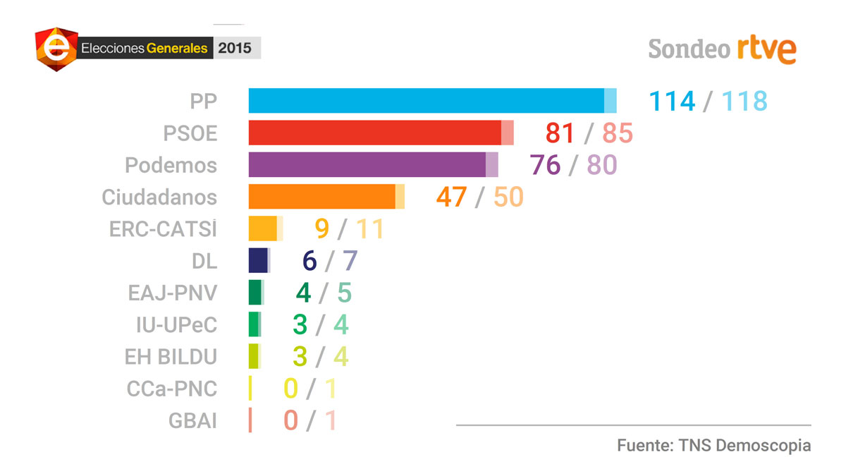 Begoña Villacís subraya en TVE que el bipartidismo ha acabado: «Y eso es muy bueno para todos». Nervios en la sede del PP porque no salen las cuentas: no tendrían mayoría sumando sus escaños con los de Ciudadanos, según informa RNE. En la sede de Podemos, sin embargo, se ha desatado la alegría: hay gritos de «sí se puede» y de «remontada».
