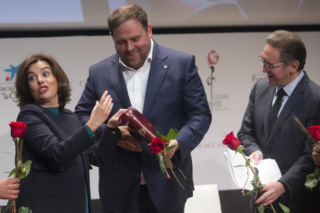 Redacción – Parte del dinero incluye los gastos del referéndum separatista y todos los gastos de los 2 años de Gobierno del fugado Carles Puigdemont. Así recoge la agencia Efe hoy: «De los 5.454 millones de euros de la ‘factura’ del FLA, un total de 833,1 millones corresponden a la amortización del fondo de 2012; 1.351,8 millones al de 2013; 989,1 millones al de 2014; 1.411,5 millones al de 2015; 49,6 millones al llamado FLA social y otros 818,9 millones a los mecanismos de pago a proveedores». Así pues, «el 58 % del dinero que la Generalidad de Cataluña tiene previsto pedir al FLA en 2018 se usará para retornar los recursos solicitados en años anteriores a través de este mismo mecanismo», son datos del propio Gobierno del PP que gestiona desde la aplicación descafeinada del Artículo 155 de la Constitución en Cataluña del pasado final de mes de octubre de 2017 todas las finanzas de la Generalidad de Cataluña. Barcelona (España), lunes 1 de enero de 2017. Fotografía: Barcelona (España), 21.06.2017. La vicepresidenta del Gobierno de Mariano Rajoy, Soraya Sáenz de Santamaria Antón, entrega una rosa y libro al delincuente exvicepresidente y consejero de Economía y Hacienda del Gobierno cesado d ela Generalidad de Cataluña, Oriol Junqueras. Efe