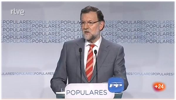 Rajoy: «No podemos estar satisfechos con los resultados. Intentar negar esto es tan absurdo como negar que hemos ganado las elecciones», dijo y recordó que «los resultados de ayer no son los que nos hubiera gustado pero somos la fuerza política más votada. Reflexionaremos para mejorar», manifestó fríamente tras años sin comparecer en la sede de su formación. En su última comparecencia en Génova 13, Rajoy prometió mano dura contra comunidades autónomas que incumplen el déficit presupuestario; hecho que nunca hizo sino que ha estado regando más dinero al presidente catalán para financiar sus proyectos de construcción del futuro estado catalanista.